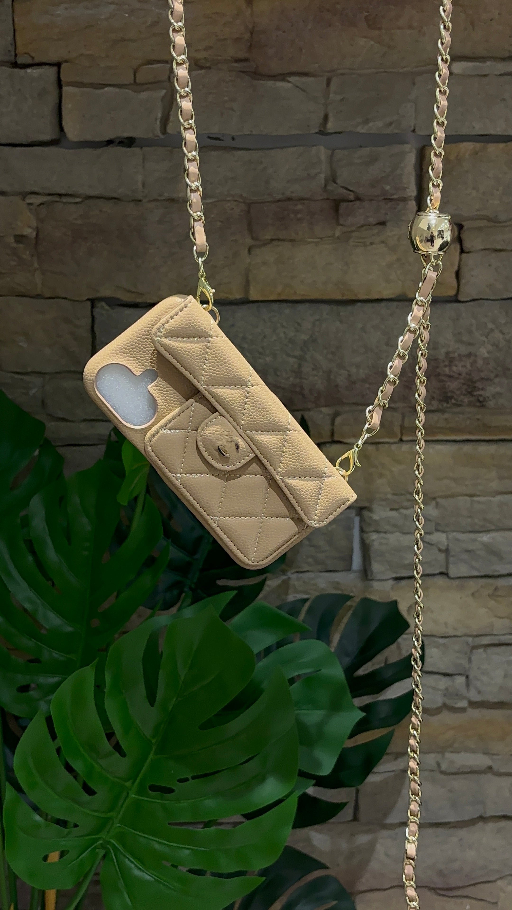 Étui de téléphone matelassé marron clair classique CeCe avec chaîne dorée
