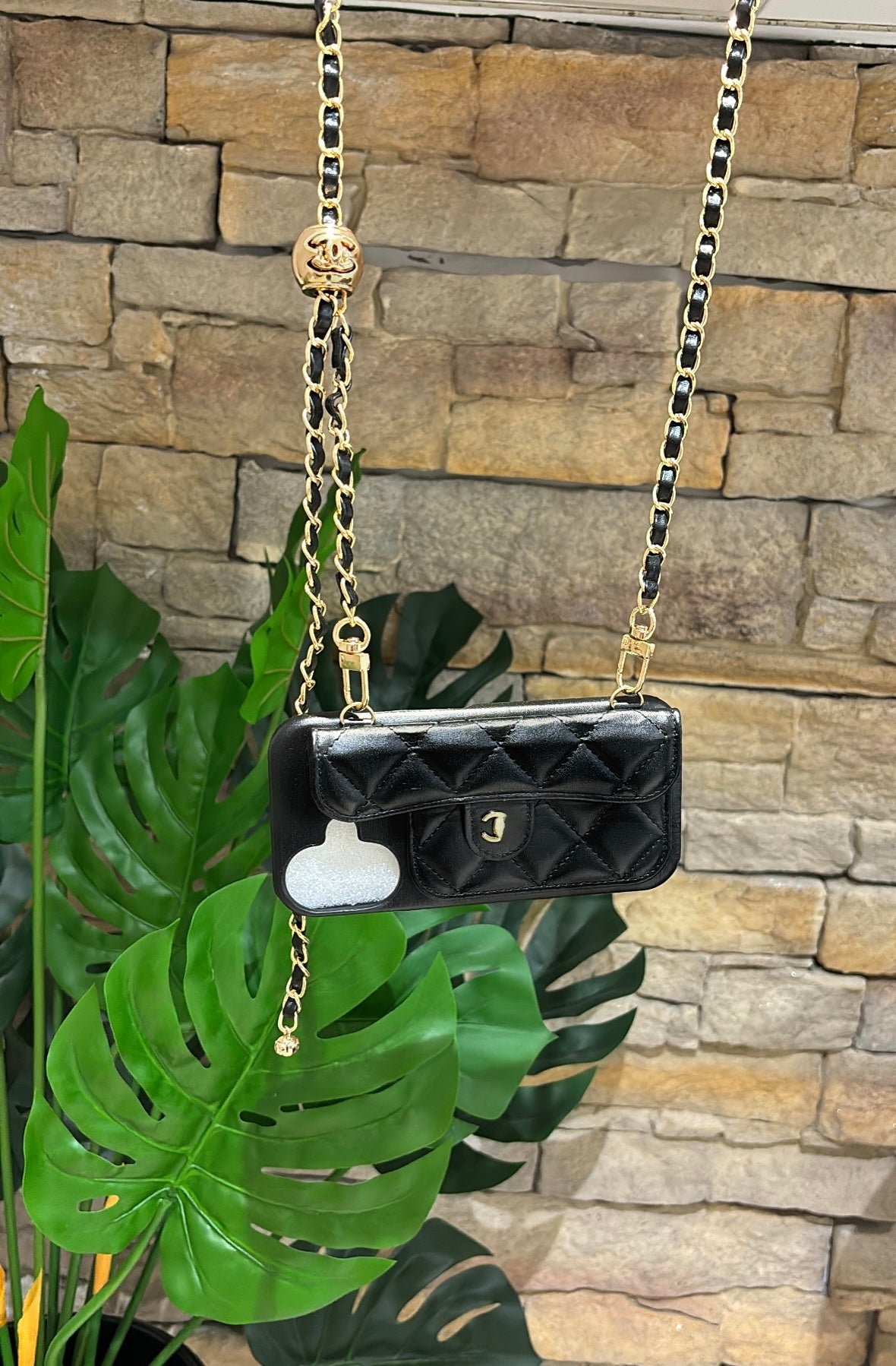 Étui de téléphone matelassé noir de luxe CeCe avec chaîne dorée